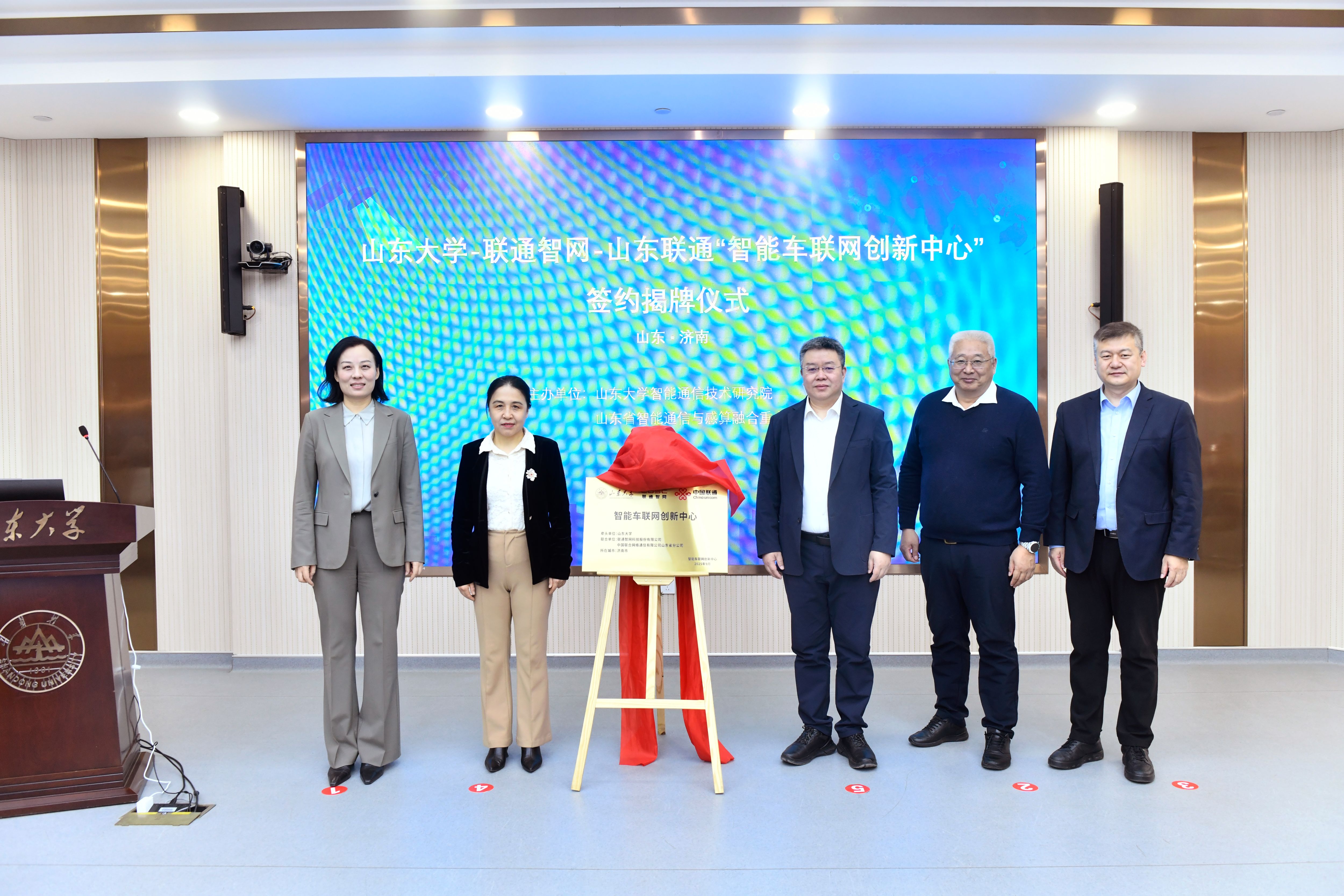 会上同期举行了“山东大学-联通智网-山东联通”智能车联网创新中心揭牌仪式。中国联通智网科技股份有限公司党委书记、董事长张然懋,山东大学副校长王美琴,山东联通副总经理林军,智能通信技术研究院院长张海霞,联通智网车辆智能网联研究院院长周光涛共同为创新中心揭牌。